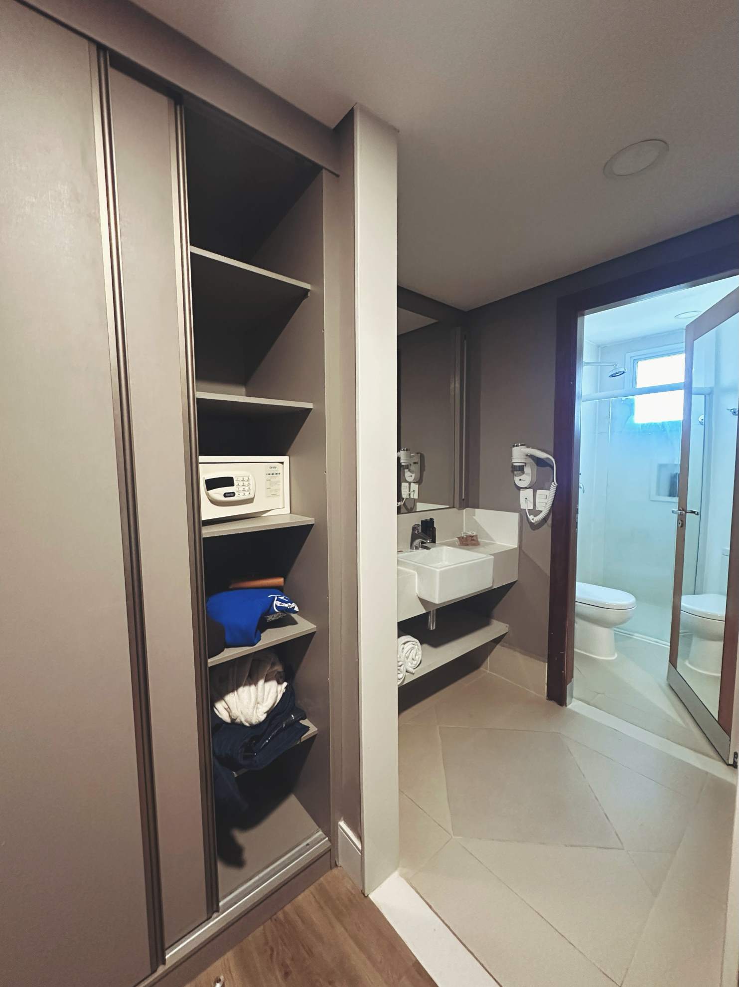 Os quartos possuem cofre, secador de cabelos, ar condicionado, tv, frigobar e amenities de marca própria.